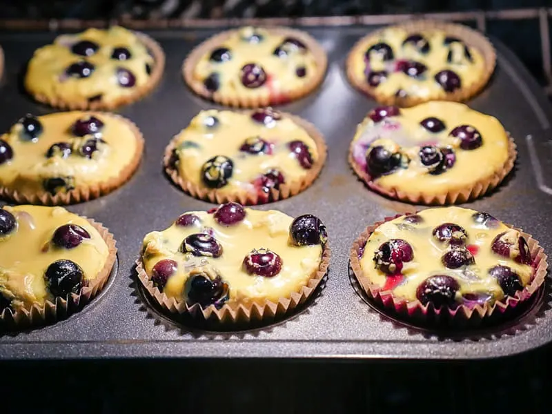 Stir in some blueberries and then divided the mixture in a lined or greased muffin tin.