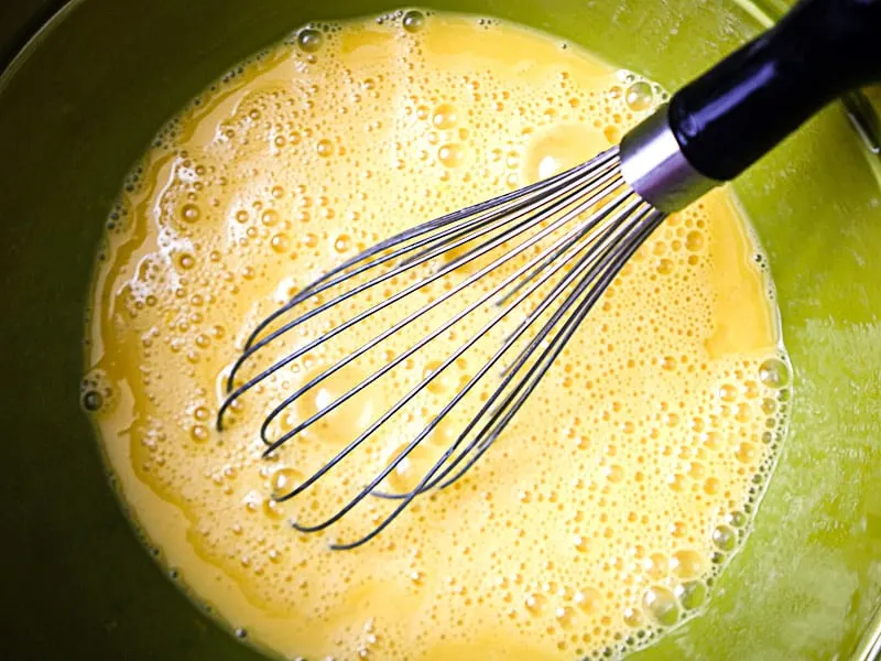 Start by whisking together 10 eggs with some coconut milk, vanilla, coconut aminos, lemon zest, and sea salt.